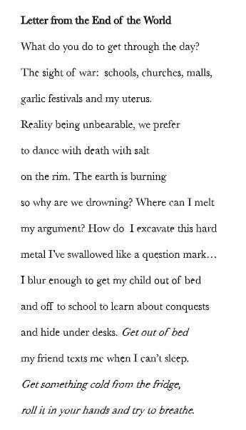 Richard Wilbur said, “One of the jobs of poetry is to make the unbearable bearable by clear, precise confrontations.” When it feels like the world is ending, we notice things around us in a new way. Our attention becomes very present to detail. That’s what fueled my latest book of poems, Pandemic City, written while New York City was in lockdown in 2020. The world is always ending a little bit, isn’t it? My new manuscript in progress is called Letters From the End of the World and in it I try to stay present to my experience and record the beautiful details with a heart open despite clear eyes on our demise.